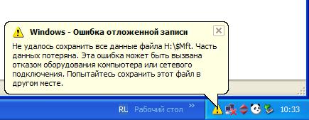 Проблема при сохранении данных на флешку, переносной жёсткий диск, ресурс сети или встроенный жёсткий диск компьютера. Система обычно выдаёт вот такое окошко внизу справа, около часов. Содержание окошка: Windows - Ошибка отложенной записи. Не удалось сохранить все данные файла H:\$Mft. Часть данных потеряна. Эта ошибка может быть вызвана отказом оборудования компьютера или сетевого подключения. Попытайтесь сохранить этот файл в другом месте. Вроде бы всё сказано, но, как это обычно бывает с подобными окошками, непонятно главное: что делать, если ошибка повторяется? А она повторяется и повторяется снова и снова, вынуждая юзера принимать необдуманные меры, среди которых форматирование, переустановка системы и даже выброс жёсткого диска на помойку... Как же юзер удивляется, когда после ВСЕХ вышеперечисленных действий проблема повторяется снова на НОВОЙ системе и НОВОМ жёстком! Что называется "не ждали?" Итак, сия проблема имеет системный характер, потому и решать её надо системно: