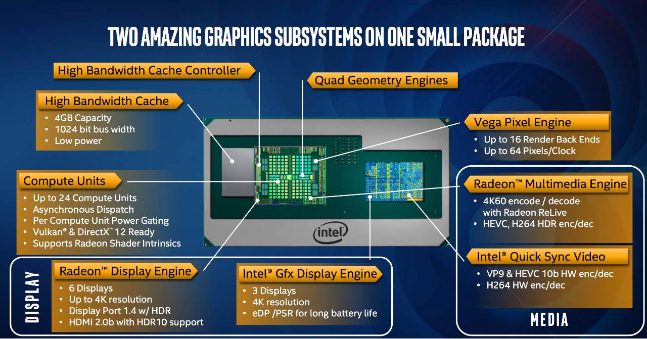 Представленные в начале 2018 года чипы Intel G-серии базируются на вычислительных ядрах Intel Core восьмого поколения, графических ускорителях Vega и новом стандарте высокоскоростной памяти HBM2. Что интересно, видеоускоритель для комбинированного чипа разрабатывало то же подразделение компании AMD, что и проектирует под заказ чипы для ведущих компаний по производству консолей (Xbox и Playstation). Процессор и графический ускоритель распаяны на единой подложке при помощи технологии от Intel, шины Embedded Multi-Die Interconnect Bridge (EMIB). Несмотря на то, что CPU и GPU представляют собой два отдельных чипа, как это обычно бывает с дискретной графикой и процессором, система распознают новую разработку как единое целое, как чипсет с интегрированной графикой. При этом новая технология EMIB обеспечивает высочайшую скорость обмена данными при не самой высокой дороговизне изготовления. CPU связан с GPU при помощи шины PCI-Express 3.0.