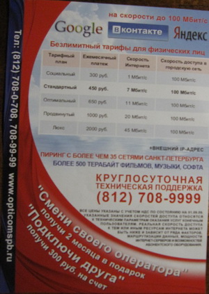 Меня привлекли два месяца бесплатного инета при смене оператора, во вторую очередь мне был интересен пиринг с другими сетями и, конечно, я посмотрел на цены: они ничем не отличались от тех, что у меня чейчас. Возникли два вопроса: два месяца будут ничего не стоить или будут стоить 10руб./день, то есть 300руб. в месяц? (обратите внимание, эта информация на первой стороне находится рядом) и скорость ограничена указываемым в прайсе лимитом или это минимальный порог, а на деле скорость может подниматься выше (как у подключенного сейчас провайдера)?