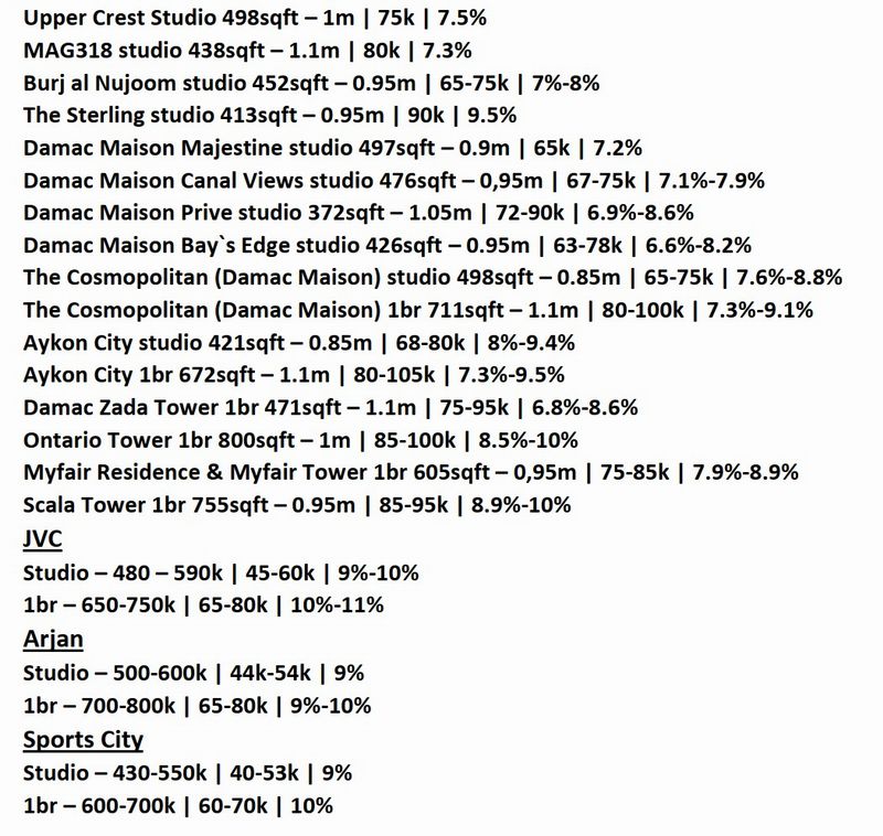 В стоках партнёров также встречаются объекты в Al Furjan, Azizi Riviera и Damac Hills. Но здесь чуть более высокая стоимость на покупке и средний рынок на аренде, доходность колеблется от 7% до 8%, проигрывая в конкурентной борьбе тому же JVC. На том же уровне находится район JLT, где можно найти студию за 900k и сдавать её за 70тыс., получая 8% годовых.