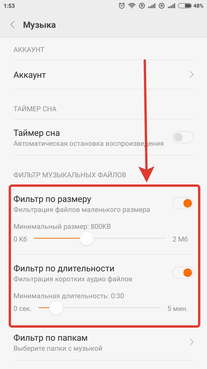 - Первый пункт - фильтр по размеру. Если размер музыкальных файлов меньше 800КБ, то по умолчанию они будут отфильтрованы.