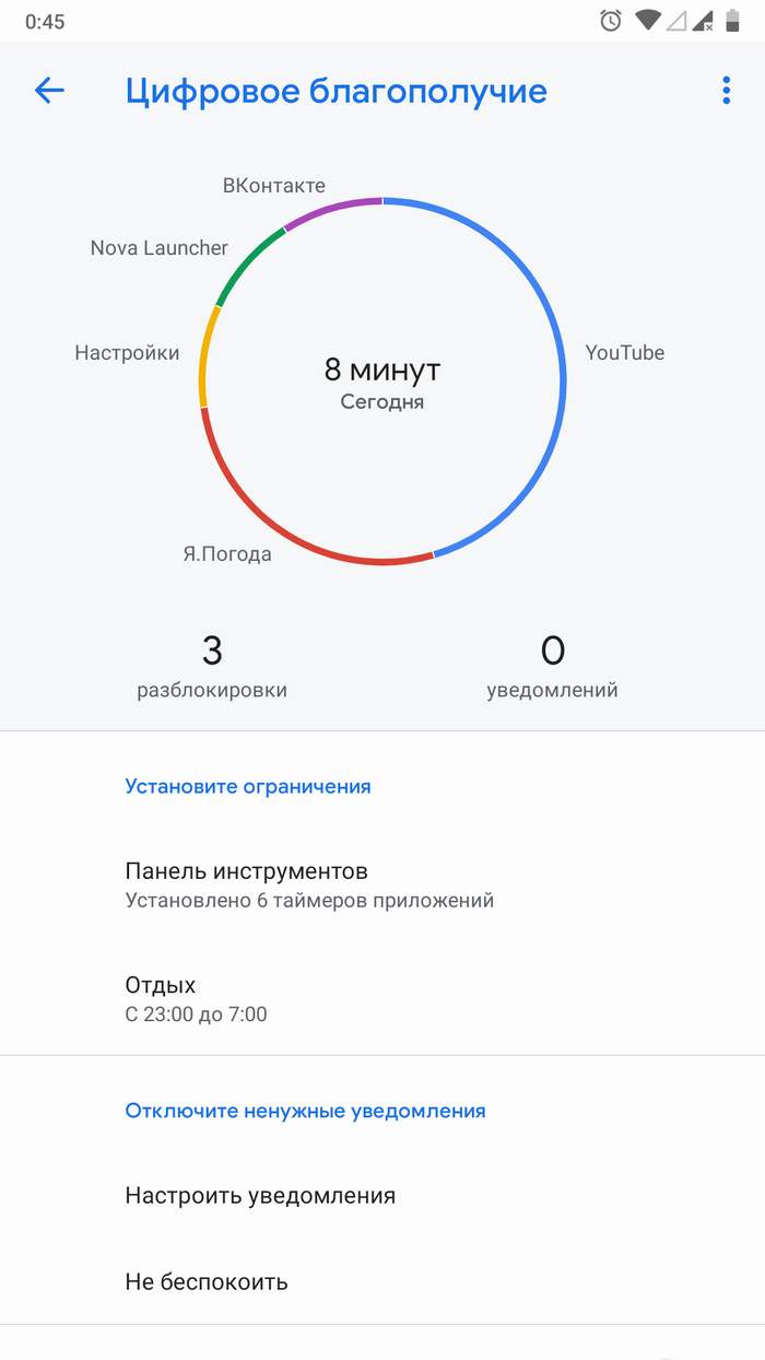 К сожалению, никаких ограничителей активности в социальных сетях и приложениях, играх на более ранних версиях ОС нет. Эта функция пока что доступна для очень малого количества людей, да и те не все рады ее появлению. Конечно, посмотреть на то, сколько раз смартфон заблокировался за день, сколько уведомлений пришло в той или иной программе, сколько времени потрачено на просмотр контента, весьма интересно, но не более. Все равно благополучие это зависит от самого пользователя - если он захочет залипнуть, то отключить таймер не составит труда. Если же человеку нужно отдохнуть и он измотан, то можно выключить аппарат и тогда действительно никто и ничто не достучится, не дозвонится и не допишется.