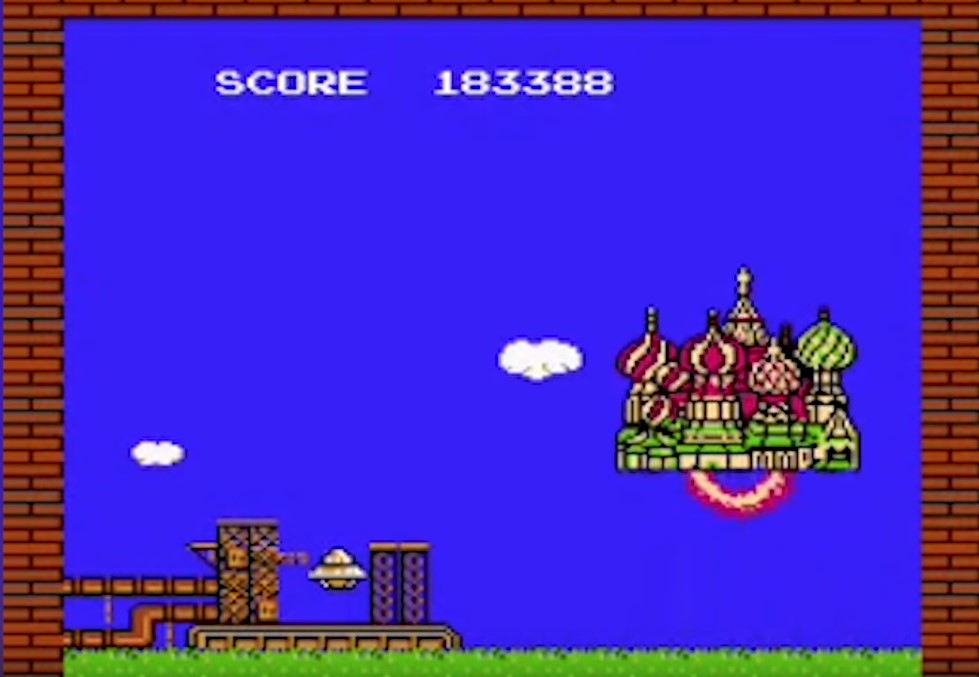 - В одной концовке игрока встречают популярные персонажи различных видеоигр и пиксельный храм, аналог настоящего храма на Красной площади. Пока персонажи прыгают и веселятся, купола храма взлетают вверх словно маленькие ракеты;