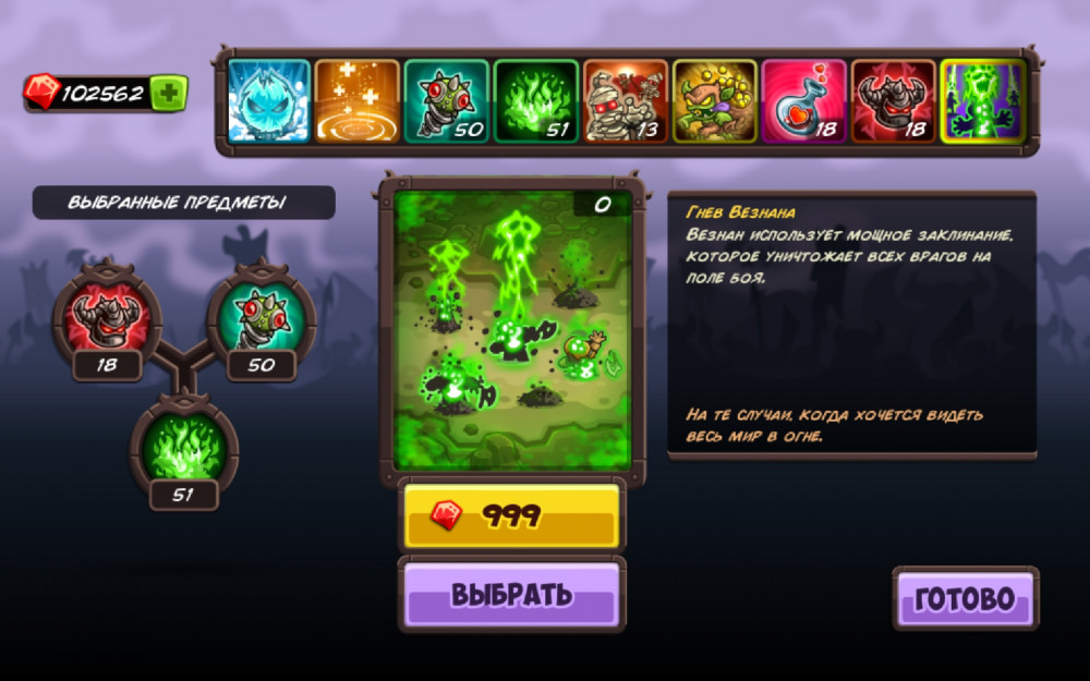 К нововведениям Kingdom Rush Vengeance можно отнести покупные заклинания, которые вы можете одноразово использовать. Покупаются они за кристаллы. Вы зарабатываете их за победы, а также получаете за выполненные задания (убить 30000 врагов, открыть определенного героя). Заклинания есть разные: от простых бомб и до мин с фараонами и мощных роботов. 1543770954 bashnya 1
