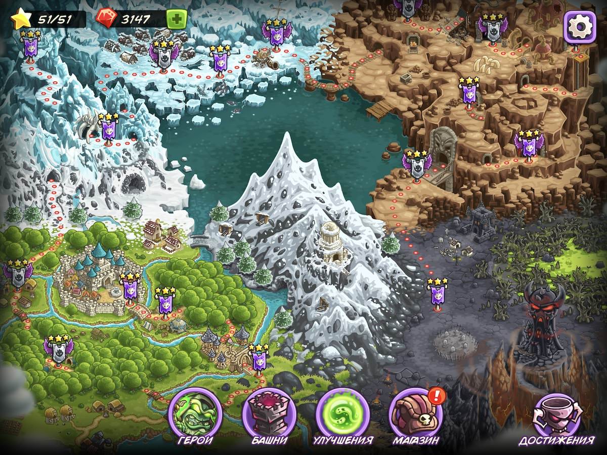 В Kingdom Rush Vengeance вы воюете не за добрых эльфов, благочестивых людей или умных гномов. Вы играете за самую настоящую нежить! Так что в случае с Kingdom Rush Vengeance добро не всегда побеждает. Сюжет и завязка новой части проста и подается в формате комиксов: Тёмный Властелин вырвался из ада и готов пройтись катком по всем добрым силам, населяющим фэнтезийный мир. Путешествовать вместе с армией зла вы будете по трём локациям, которые отличаются друг от другого биомами: пустыня, снежная местность, болото и лесистая. karta miraНа каждой локации есть шесть чекпоинтов-миссий, которые обязательны к прохождению. Все миссии сюжетны, вы не можете перепрыгивать через них, а также брать побочные квесты. И это, наверное, главный недостаток Kingdom Rush Vengeance – её невероятно мало. Усидчивый геймер сможет пройти всю игру за один день. Да, есть некоторые подсластители в виде дополнительных режимов на каждом чекпоинте, но «Гороический» и «Железный вызов» не меняют правила игры, а просто поддерживают интерес к игре еще на пару дней, но не больше.